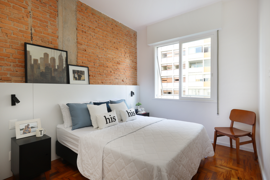 No que se refere aos quartos, a suíte extra foi mantida como quarto de hóspedes para acolher a família de Tom, um dos moradores, que é australiana. A suíte principal ganhou mais espaço e agora conta com closet e home office. No que diz respeito aos materiais, os tijolinhos aparentes aparecem novamente, dessa vez em sua cor original. Para tanto, as paredes foram descascadas e tiveram um tratamento para que ficassem adequadas para o ambiente.
