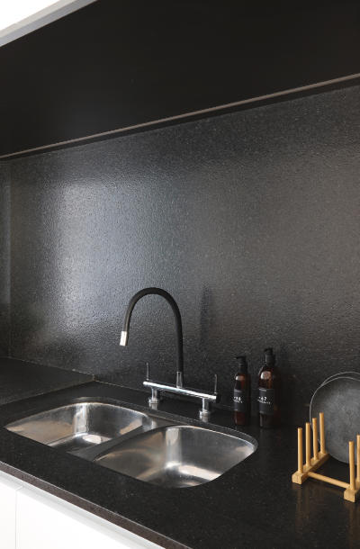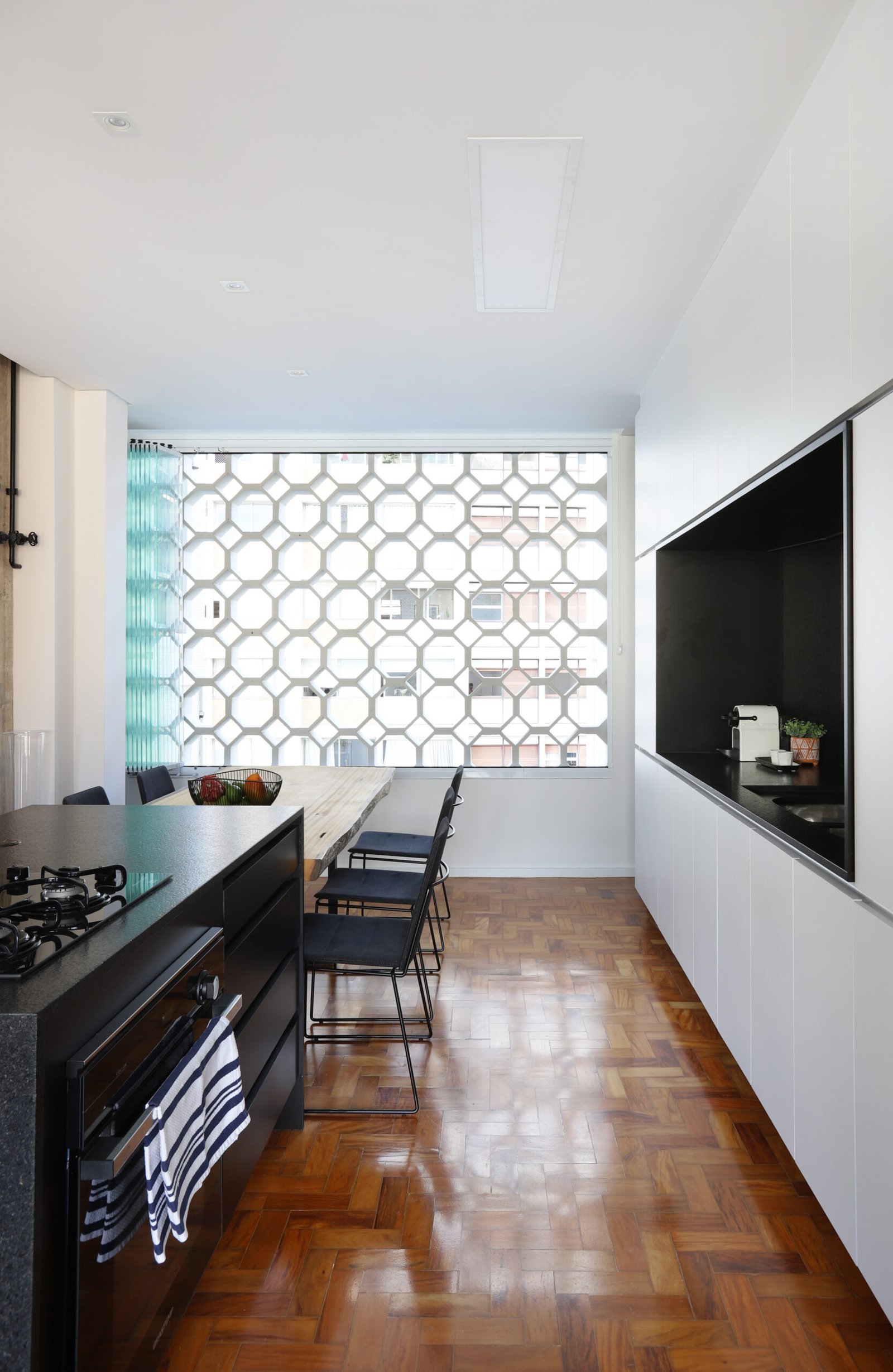 Para transformar totalmente a cozinha e torná-la parte do living, as especialistas inverteram a posição original da bancada e remodelaram toda a área molhada, criando este efeito visual de caixa. Dentro da marcenaria branca há uma lava-louças, filtro de água e micro-ondas ‘escondidos’. Para mimetizar a geladeira, elas apostaram no preto para o revestimento da marcenaria e a pintura da parede que recebe o eletrodoméstico.