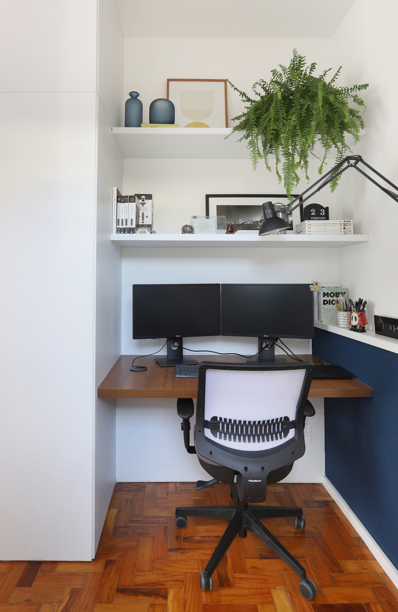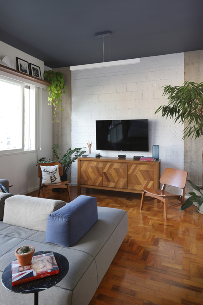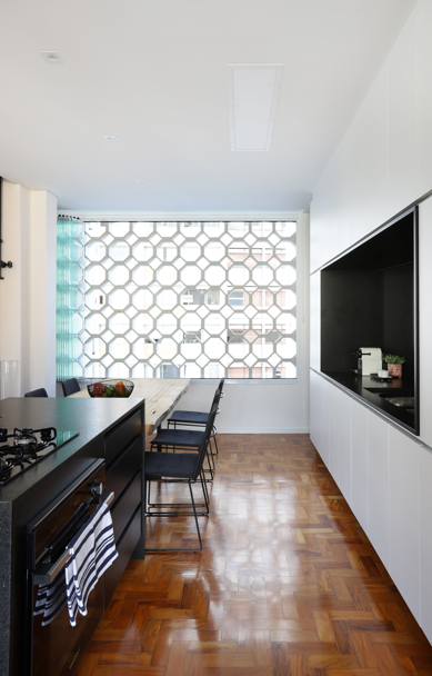 “Um dos principais desejos dos clientes era resgatar a história desta construção. Por isso, recuperamos a fachada de cobogó, que estava escondida por uma parede da cozinha, deixamos pilares aparentes em concreto e contamos com o efeito visual das paredes por meio dos tijolinhos originais da edificação”, conta Bianca. Além disso, o piso de taco também foi mantido passando por uma restauração completa e recebeu complementos em alguns pontos.