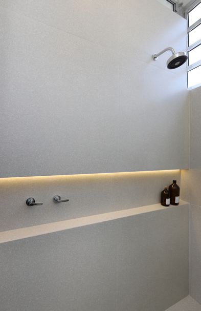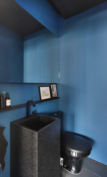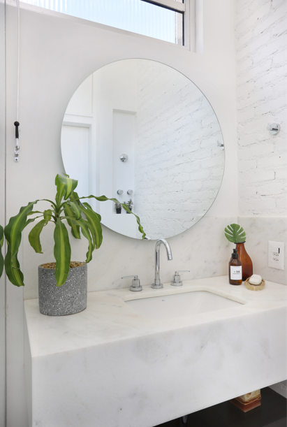 Para o banheiro do casal as escolhas seguiram a linha ‘fora do convencional’, mas estão em total sintonia com os desejos dos moradores. “Na elaboração, incorporamos uma parede de tijolinhos brancos, bancada de mármore, espelho redondo e área do box com nicho infinito iluminado. O resultado respondeu àquilo que buscávamos desde o início: resgate da história da construção original com personalização máxima às novas demandas dos moradores”, finaliza Bianca.