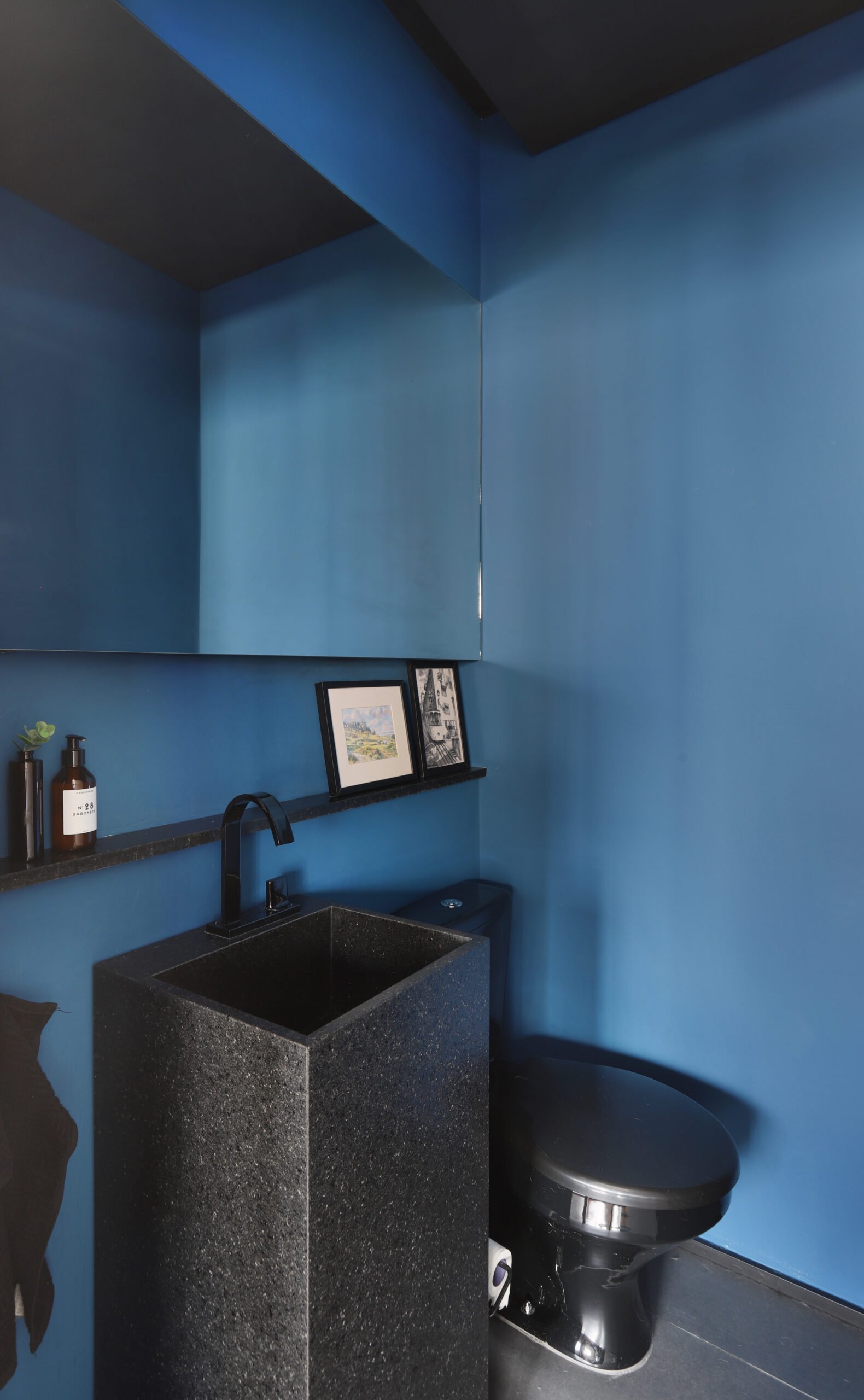 Originalmente, o apartamento dispunha apenas de um banheiro grande acompanhado e um banheiro de serviço. No novo layout executado pelas arquitetas, o cômodo maior foi dividido em dois para atender à suíte principal, como também o quarto de hóspedes.