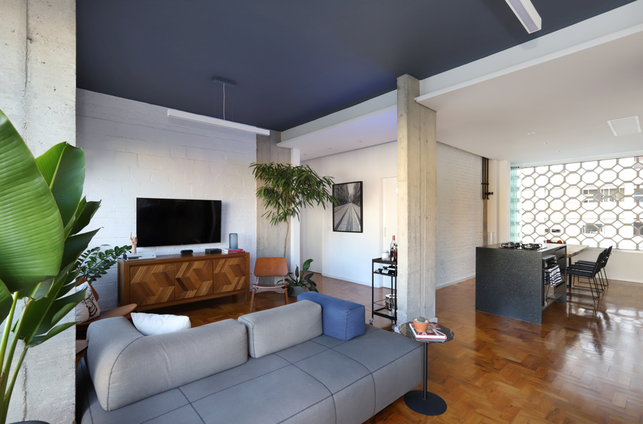 Apto de 100m² ganha área social integrada e recuperação de elementos originais da década de 1950