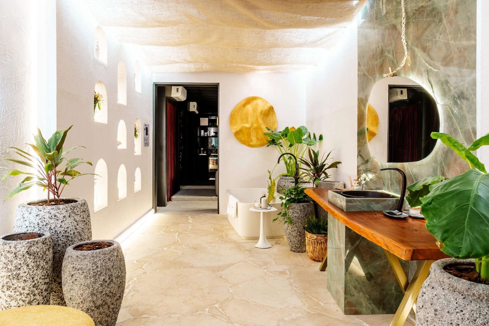 No Caminhos Deca, assinado pela arquiteta Juliana Cascaes, a referência à ancestralidade indígena mato-grossense é simbolizada na logo de entrada em cerâmica, criada pela artista Fernanda Ceolin. Esse ambiente de quase 100 m² conta com o banco Infinito, também de Fernanda Marques, contribuindo para uma narrativa de histórias e tradições.