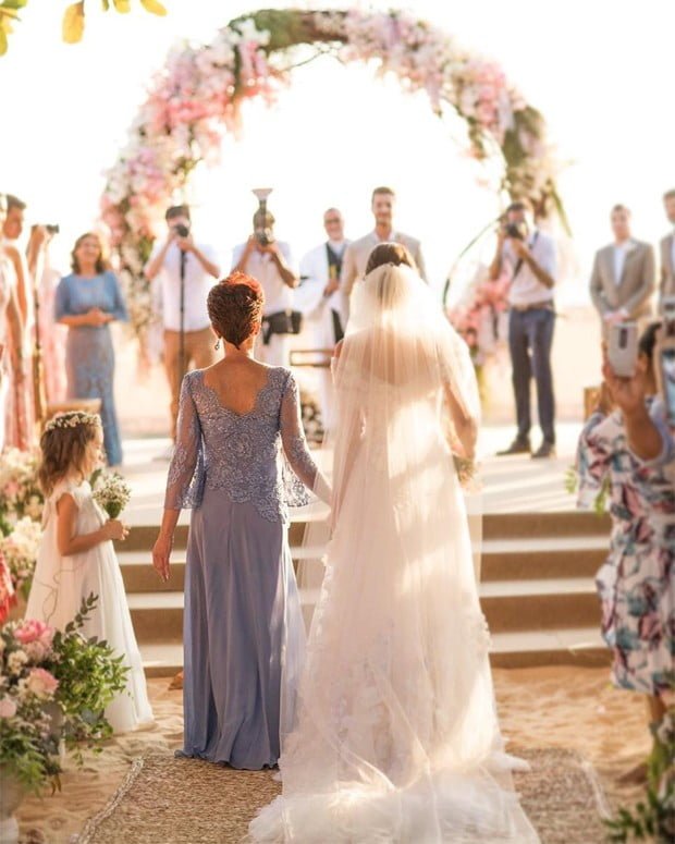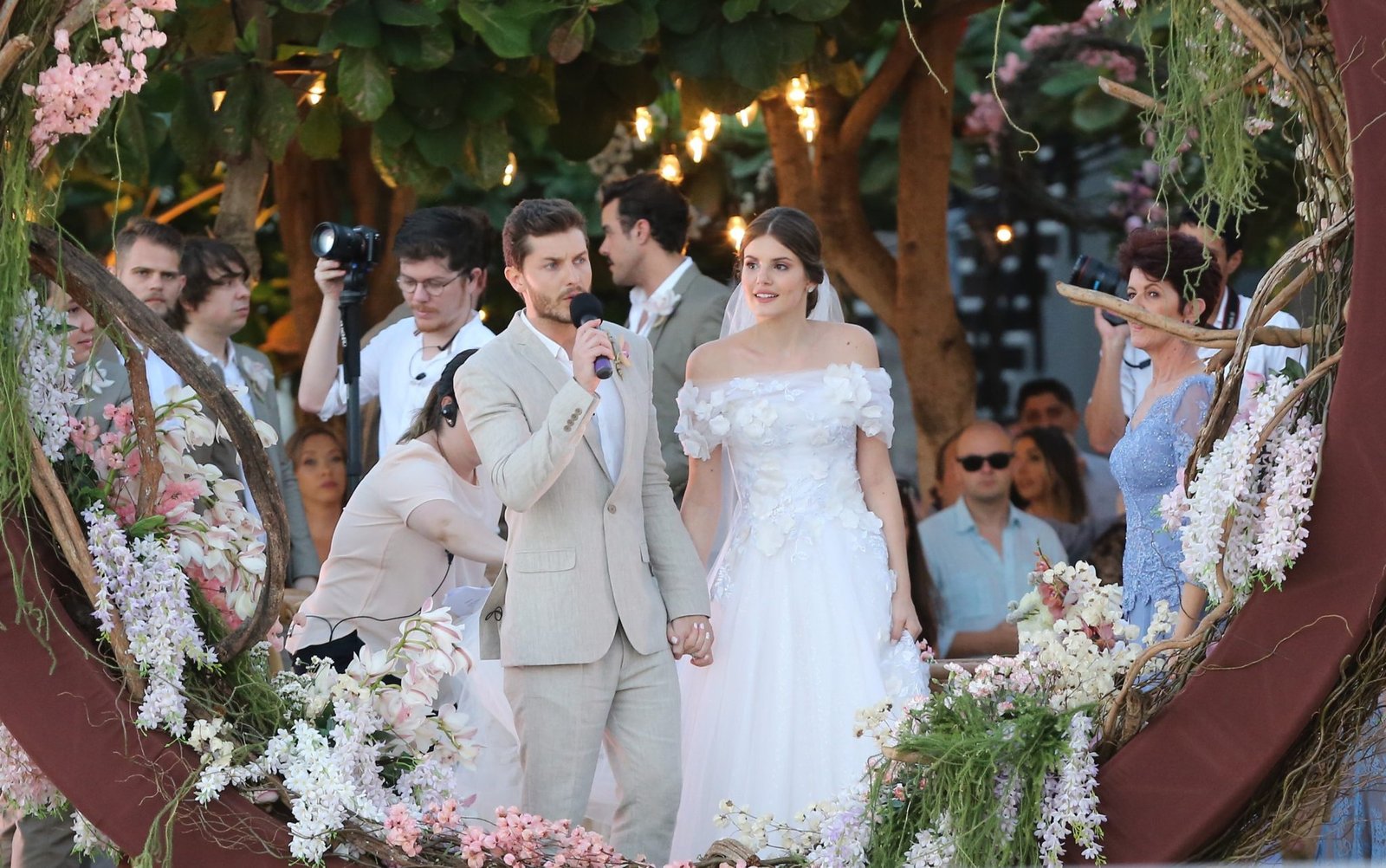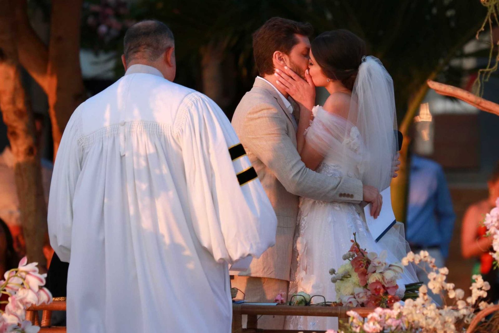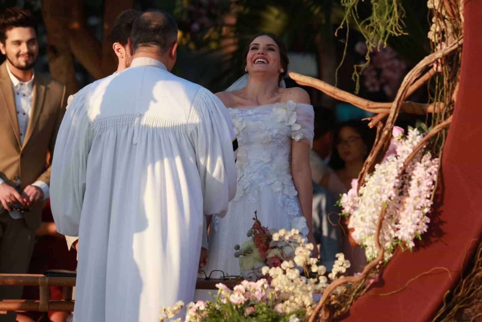 A cerimônia aconteceu na tarde deste sábado (25/8), no Hotel Essenza, na praia de Jericoacoara, no Ceará, local onde os dois fizeram a primeira viagem romântica. Para seu grande dia, a atriz escolheu um vestido da estilista Lethicia Bronstein, queridinha das famosas. Os noivos se casaram descalços.