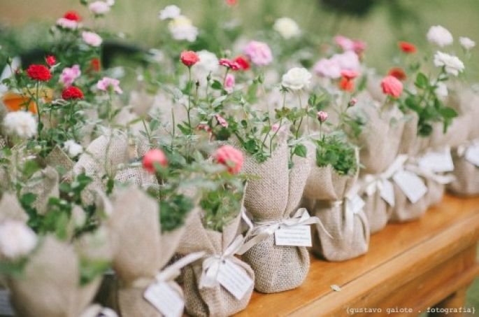 As lembrancinhas podem ser mudinhas plantadas, que possam ser consumidas como chá ou tempero, e trazerem tags de orientação eco funcionais, de como cuidar, por exemplo.