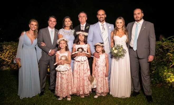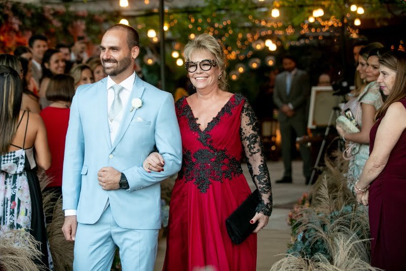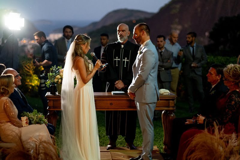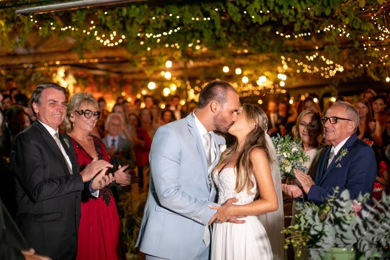 O casamento de Eduardo Bolsonaro e Heloisa Wolf no bairro de Santa Teresa (RJ), no finzinho da tarde, reunindo, em uma cerimônia religiosa descolada e uma festa animada, uma média de 150 pessoas – dentre amigos, familiares e claro: o próprio Jair Bolsonaro e sua esposa (e também madrinha dos noivos) Michelle.