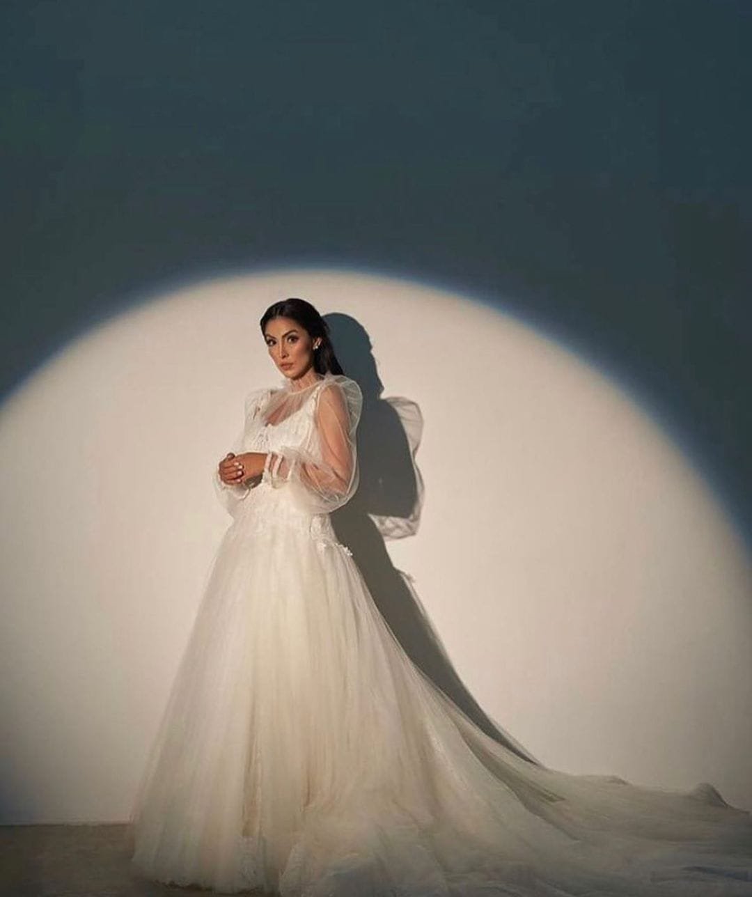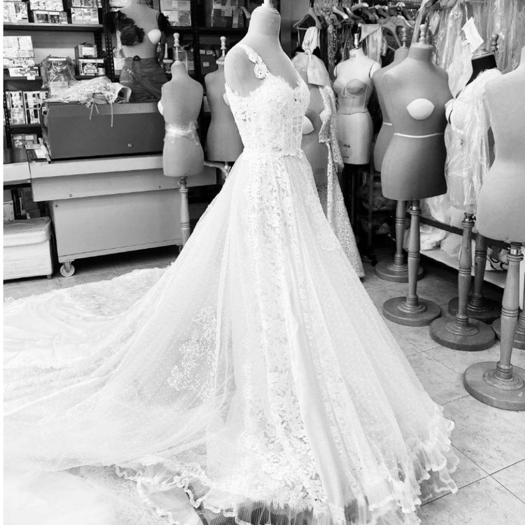 De acordo com a estilista, sua intenção ao sobrepor uma peça toda em tule sobre o primeiro vestido era para dar a sensação de que a noiva estava flutuando. Nas costas desse segundo look, botões de cristais traduziam a riqueza do modelo.