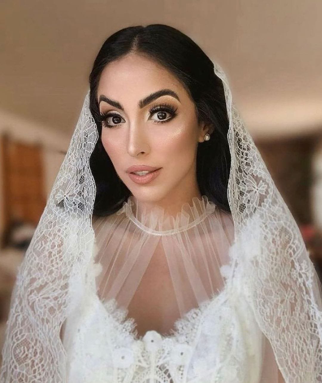 Para coroar o vestido de noiva, véu e grinalda, desenvolvida, assim como o vestido principal, com uma combinação das rendas chantilly, rebrodé e guibir artesanal.