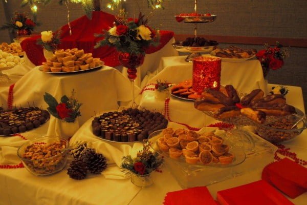 A festa também pode contar com detalhes especiais nos comes e bebes! Você pode apostar o clima natalino para servir um banquete na sua festa e combinar com coqueteis vermelhos (vodka de morango), por exemplo.