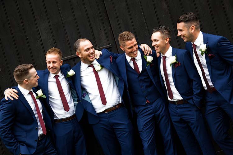 Para caracterizar o noivo e padrinhos nas cores temáticas, pode ser incorporado na gravata, sapato, flor de lapela vermelha / branca ou pequenos galhos.