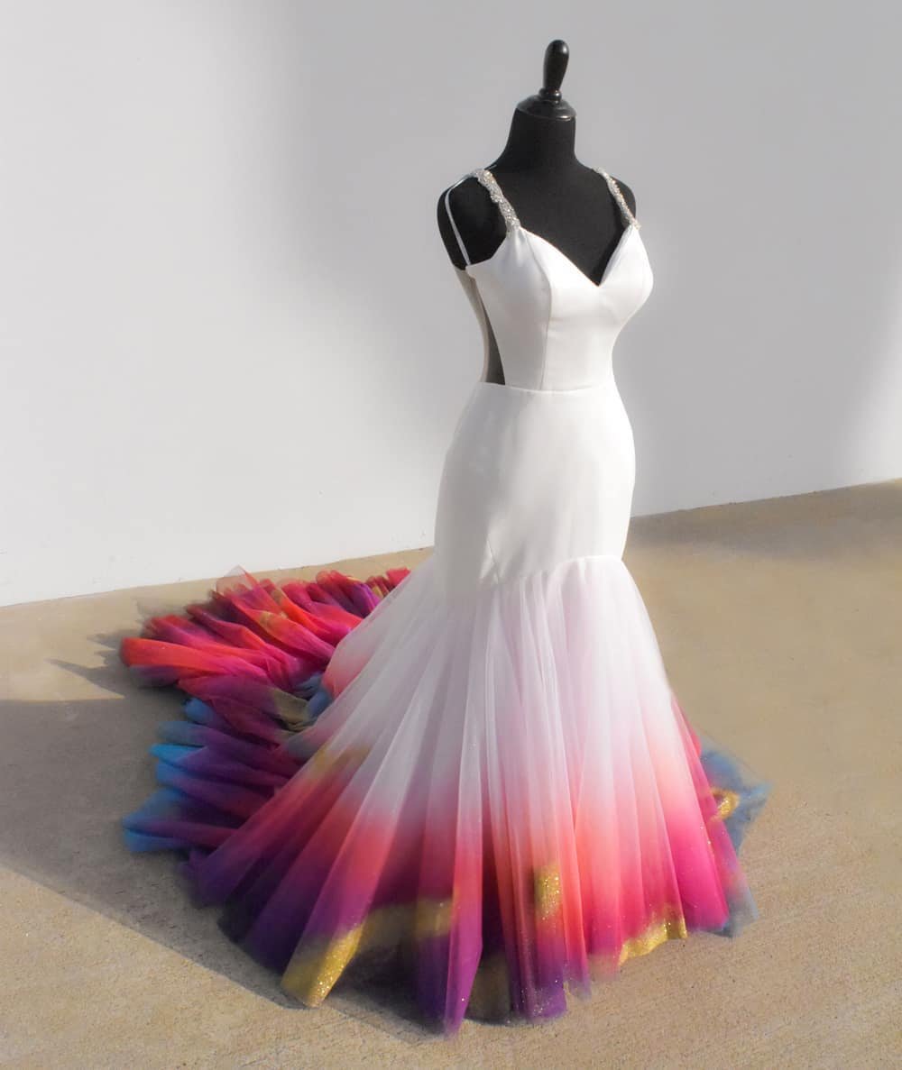 Tudo começou quando a norte-americana decidiu que seu grande dia seria exatamente cheio de cores. Com isso, escolheu o vestido perfeito para se casar e adicionou a sua personalidade.