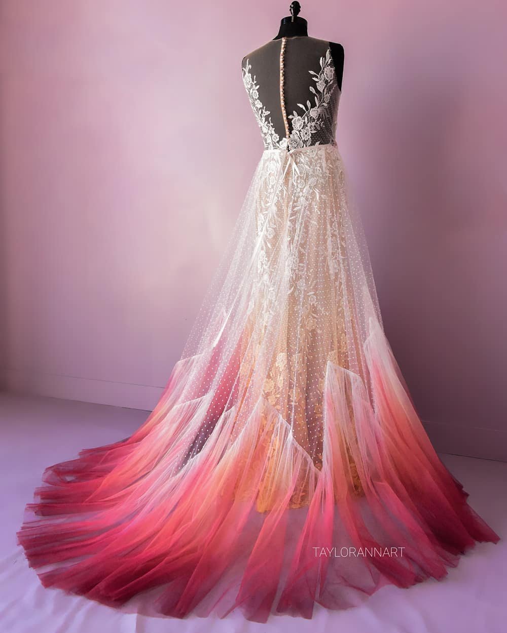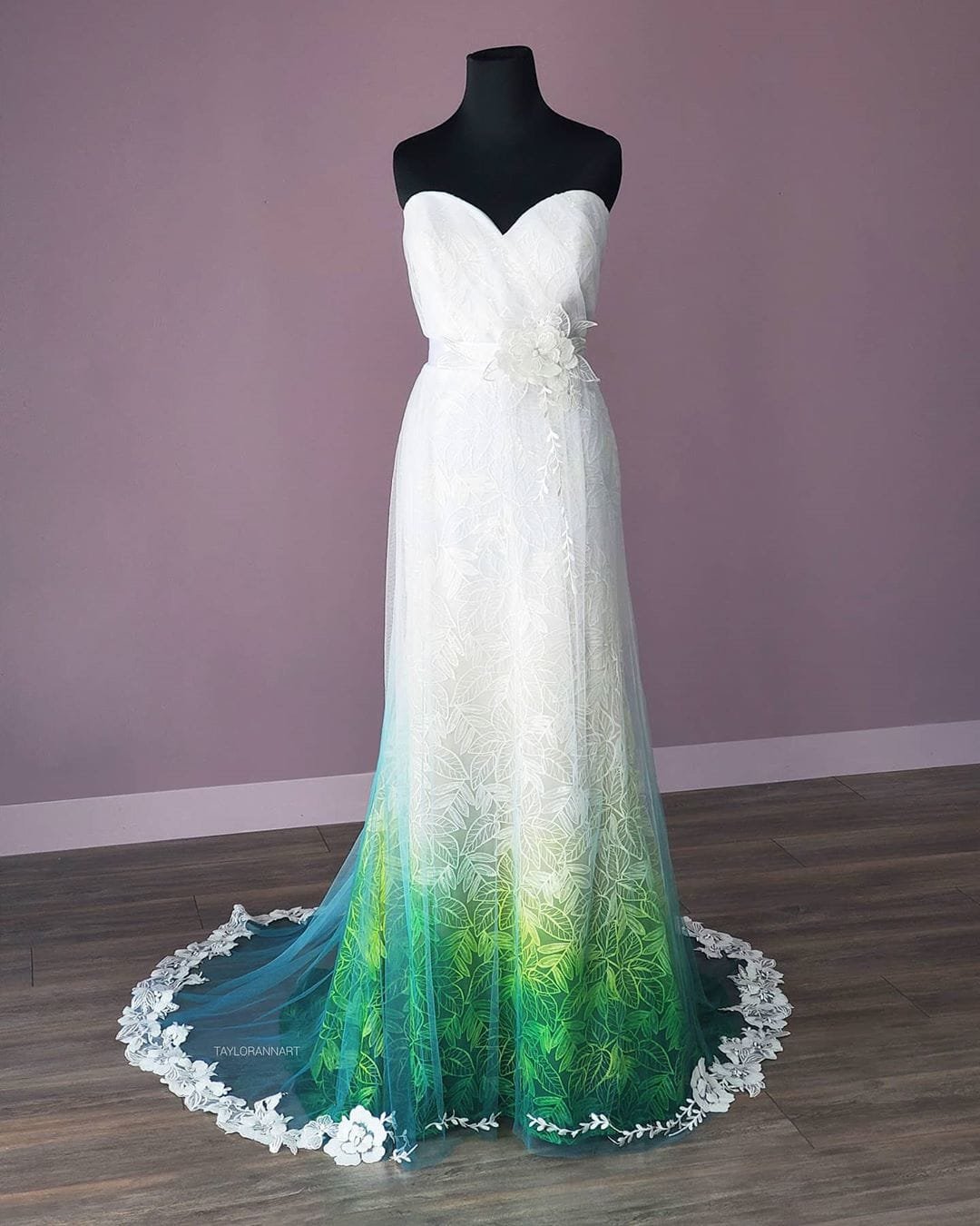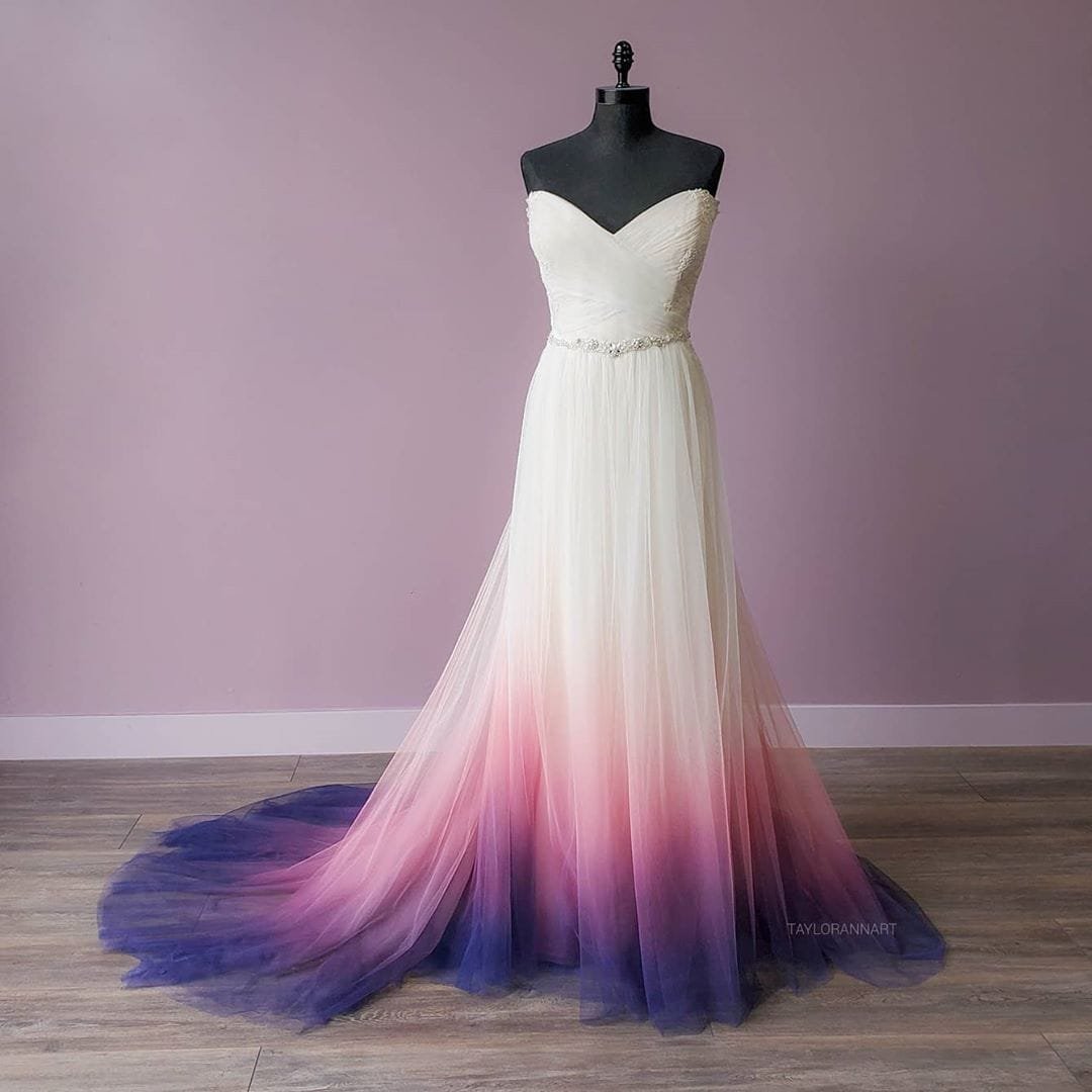 Foi o que aconteceu com Taylor Ann Linko, artista que tentava desde novinha seguir carreira na área, mas que só ficou famosa após pintar seu próprio vestido de noiva.
