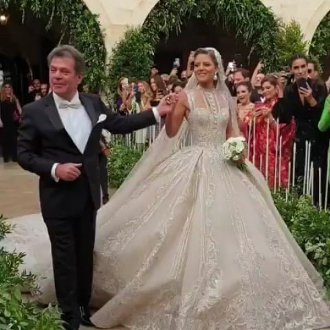 O vestido da cerimônia demorou mais de 450 horas para ficar pronto e privilegiou um corpete sem mangas e gola alta, uma saia volumosa e uma cauda de (apenas) 4,5 metros de comprimento. “O estilista cobriu com o máximo de riqueza as saias super volumosas com bordados preciosos e fugiu da renda, uma tendência que vimos nesta última semana de moda bridal. Já entraram para a história”, avalia nosso diretor de moda Pedro Sales. O véu e o tule são bordados com fios de seda e lurex em tons de champanhe e mais de 50.000 lanteijoulas.