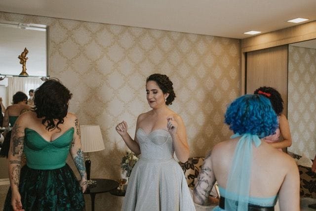 Após a cerimônia, Rubiana e o marido fizeram um jantar apenas para os pais e irmãos. “Quando tirei a parte de cima do vestido e fiquei somente com o prata, todo mundo foi à loucura. A minha sobrinha disse que eu estava ‘parecendo a Cinderela’. Claro que deu um friozinho na barriga não saber o resultado final antes do casamento, mas confiei que daria certo, conhecendo o trabalho dela, acompanhando os vestidos, tudo, eu sabia que ia ser sensacional, que eu ia ficar linda, maravilhosa, e foi isso. Durante a revelação foi tudo muito lindo, eu me senti verdadeiramente especial.”