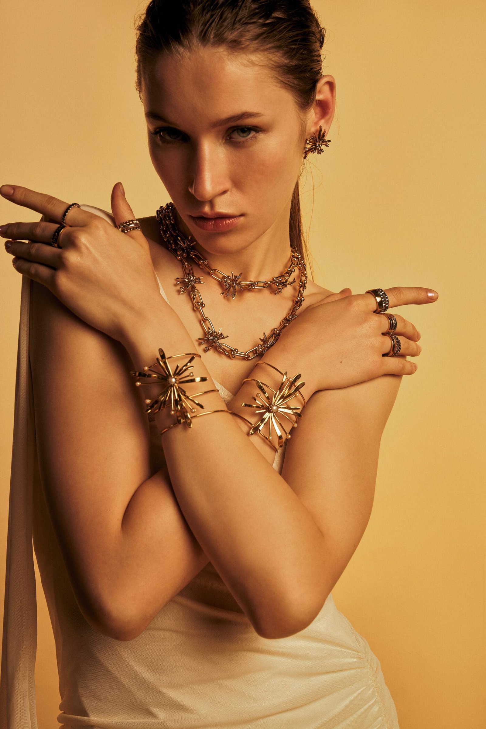 Outro destaque presente nas peças são os raios solares, desenhados para captar a vitalidade energética do verão. Eles aparecem em aneis, pulseiras e brincos, compondo uma estética moderna que se mescla com elementos vintage – uma assinatura ímpar de Monica Di Creddo.