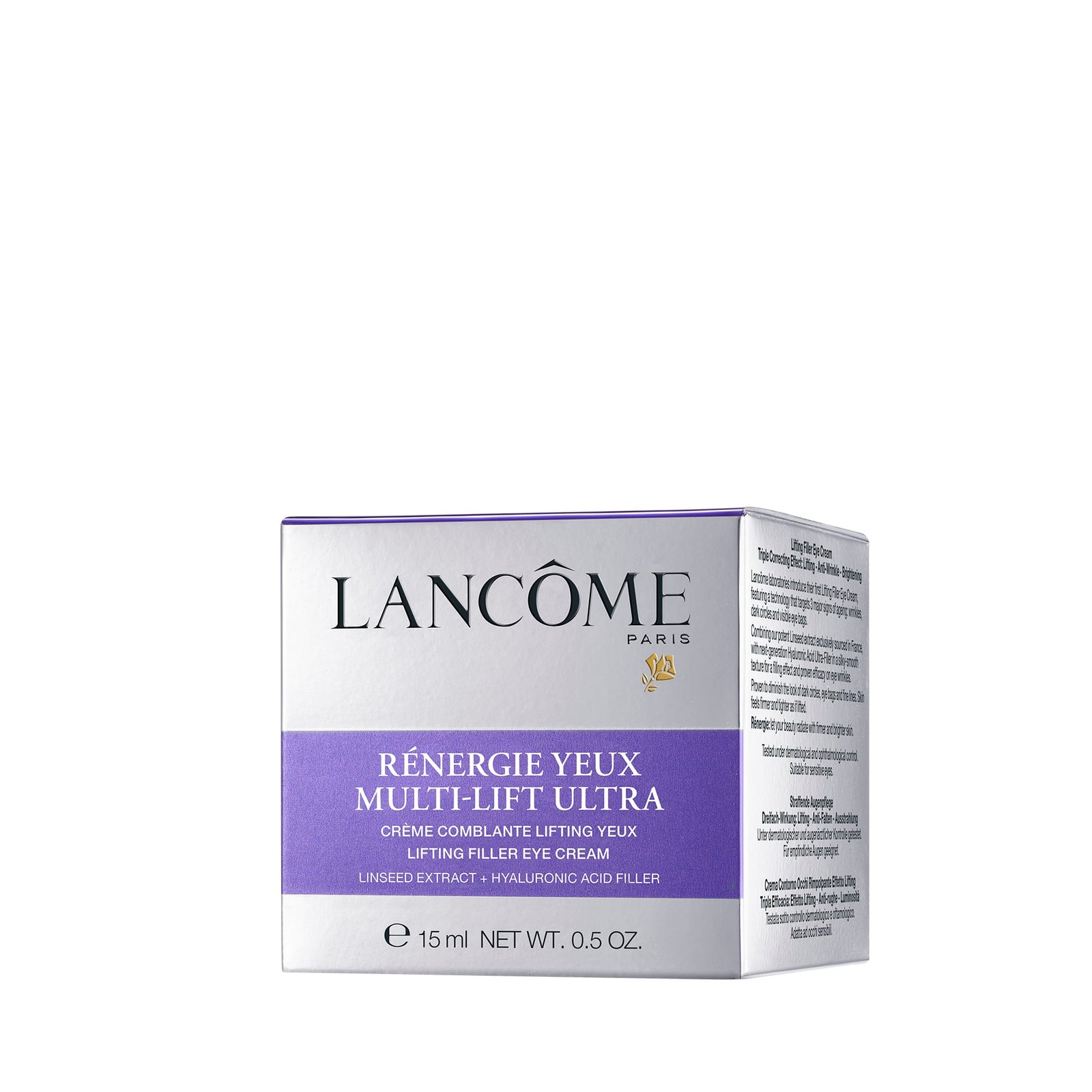 A marca de luxo francesa Lancôme apresenta o novo Rénergie Yeux Multi-Lift Ultra, um creme para os olhos com ação antissinais do envelhecimento e uma fórmula inovadora, combinando, pela primeira vez, o ácido hialurônico hidrolisado de origem natural com o extrato de linhaça ativo pró-lifting. Como a pele da área dos olhos é, em média, dez vezes mais fina do que a do rosto, essa é uma das primeiras zonas em que as linhas de expressão se tornam mais visíveis e o Rénergie Yeux Multi-Lift Ultra evita a perda de colágeno na pele, melhora a aparência das rugas e clareia as olheiras.