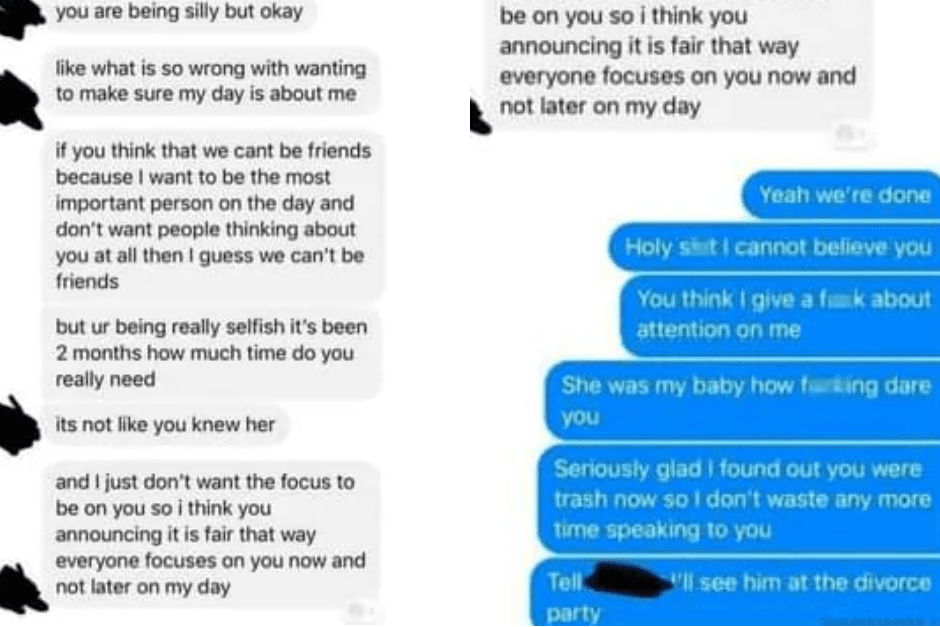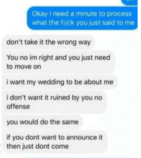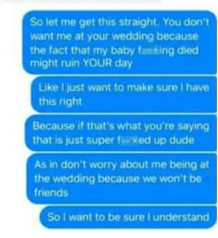 “Deixa eu ver se entendi direito: você não quer que eu vá ao seu casamento porque perdi meu bebê e isso pode estragar o SEU dia?”, ela respondeu.