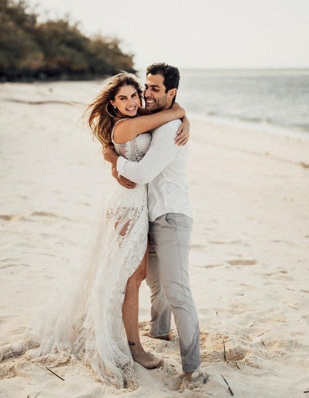 Para a cerimônia pé na areia – literalmente! -, a noiva usou um vestido da grife mineira Fabiana Milazzo: “Estamos muito, muito, muito felizes!”