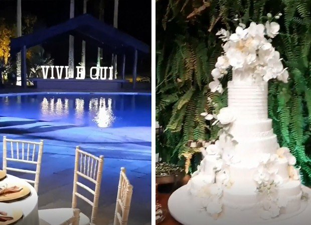 Viviane Araújo ganhou um vestido curto com uma saia sobreposta para o matrimônio. A proposta era dar a atriz um look em que ela pudesse se sentir à vontade na cerimônia e durante a curtição madrugada adentro. Ao todo, foram usados 40 mil cristais, além de joias e uma coroa. É um vestido curto com saia sobreposta. Com a saia, é para o momento inicial. O vestido curto para a festa. Já a produção da maquiagem e cabelo da atriz, ficou por conta do Júnior Mendes.