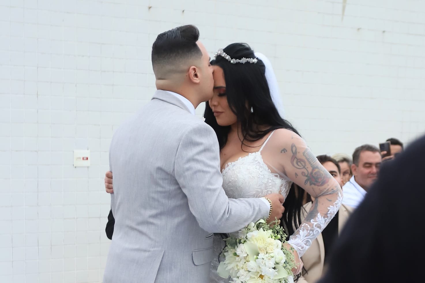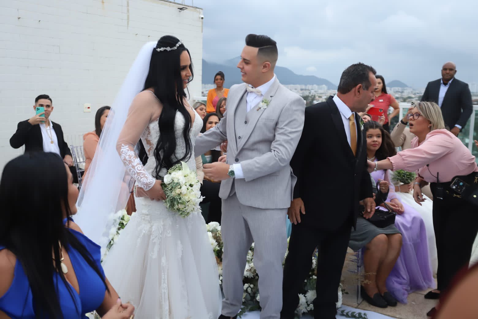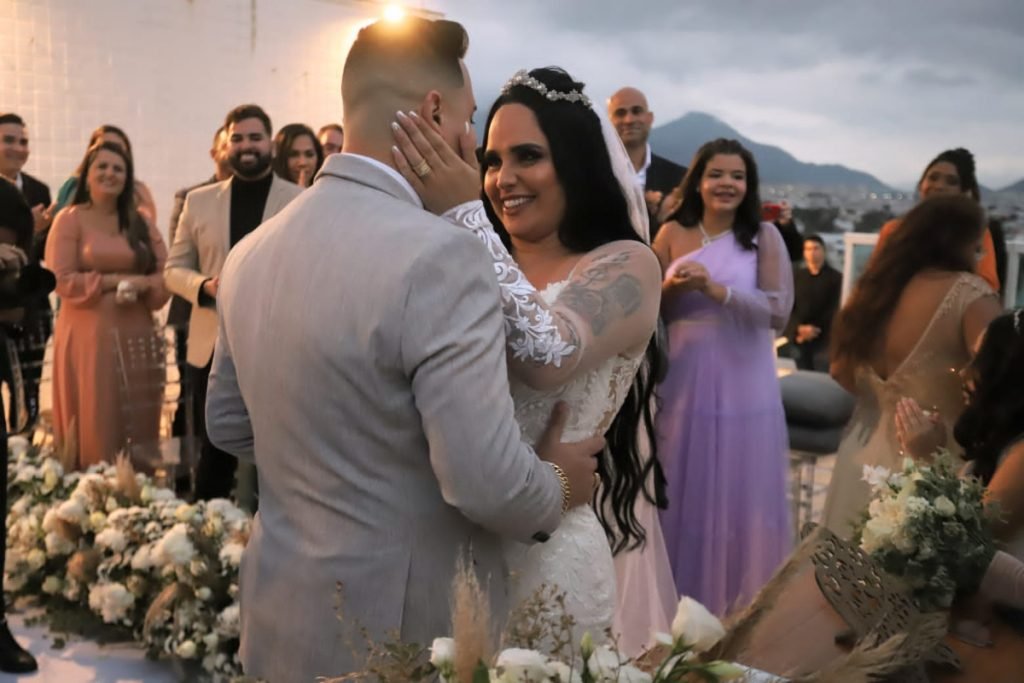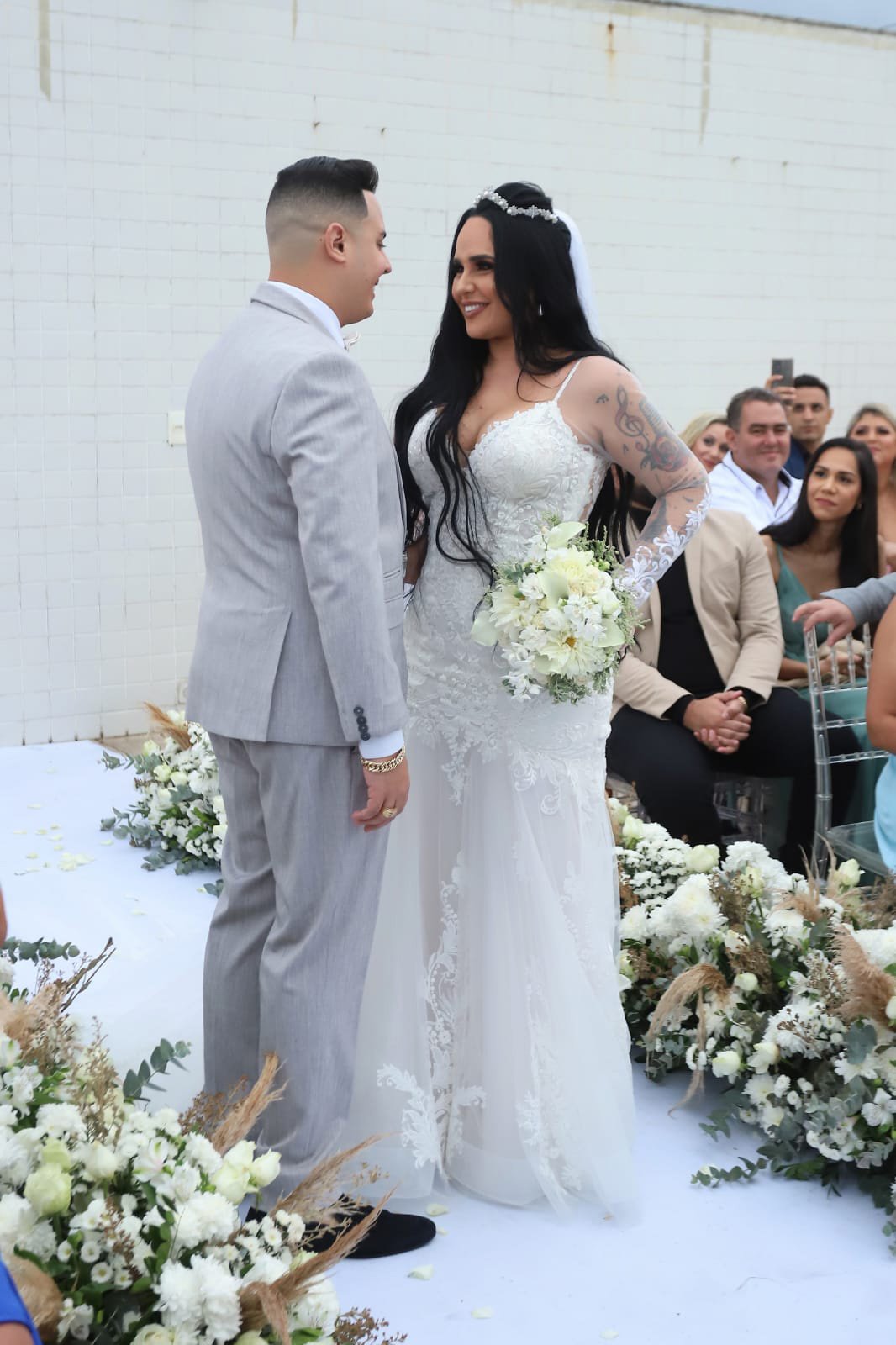 A cerimônia foi bem intimista, só para amigos, mas não deixou de esbanjar luxo. O vestido da noiva chegou a custar R$26 mil, modelo semi-sereia com cauda e manga longa. Para deixar sua personalidade falar mais alto, dando um toque especial ao modelito, em alguns locais a transparência marcou presença.