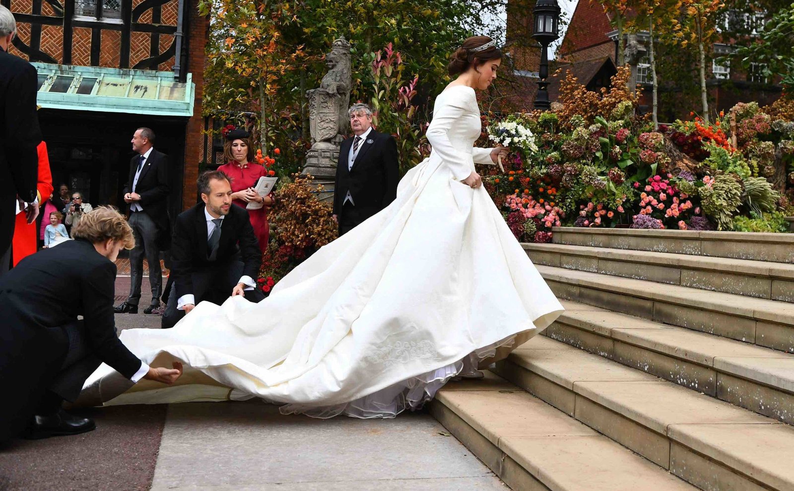 Para o grande dia, a noiva usou um vestido criado pelos designers Peter Pilotto e Christopher De Vos. A peça, apresentava um corpete justo, saia levemente plissada e decote com dobra ao redor dos ombros, até a parte inferior das costas. Segundo o jornal “Usa Today”, o modelo foi um pedido específico da princesa, que fez uma cirurgia aos 12 anos para corrigir a escoliose, de acordo com o Palácio de Buckingham. “O vestido era uma das coisas sobre as quais eu já estava decidida. Assim que marcamos o casamento, eu já sabia o estilista e o estilo, de cara”, disse em recente entrevista. Para completar a produção, ela usou uma tiara de diamantes e esmeraldas Kokoshnik Greville Emerald, feita por Boucheron em 1919 e popularizado na Corte Imperial Russa. Seus brincos de diamantes e esmeraldas eram presentes do noivo.