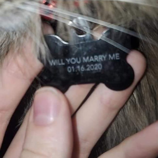 Como felinos não costumam obedecer ordens e aprender comandos, o homem resolveu fazer algo com o gato que não dependesse tanto do animal. Ele fez uma plaquinha especial para prender na coleira, escrita “quer se casar comigo?”, com a data do dia.