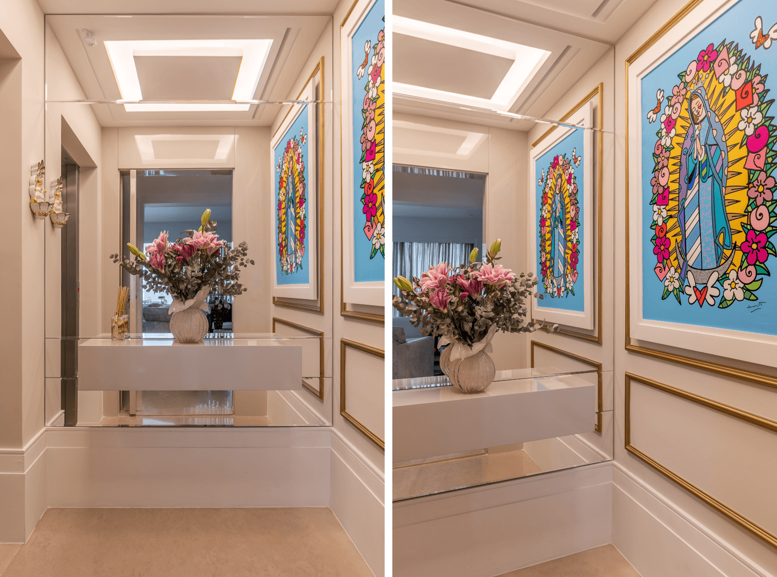 “Era muito importante entender como acomodar as obras e imagens que eles já tinham, fazer um estilo de “moldura” que desse destaque e integração ao décor da casa, a boiserie surgiu como uma forma de valorizar esses pertences, como a imagem da sala de jantar”, conta a arquiteta.