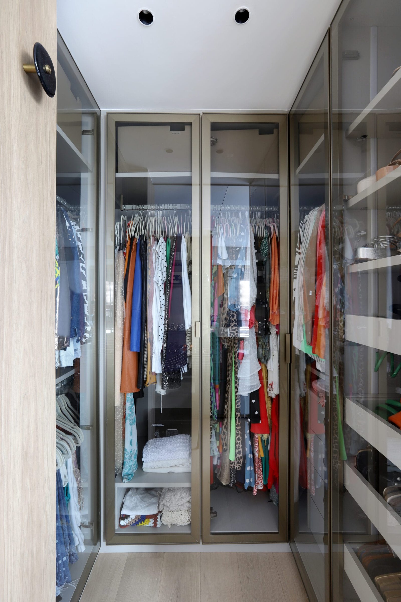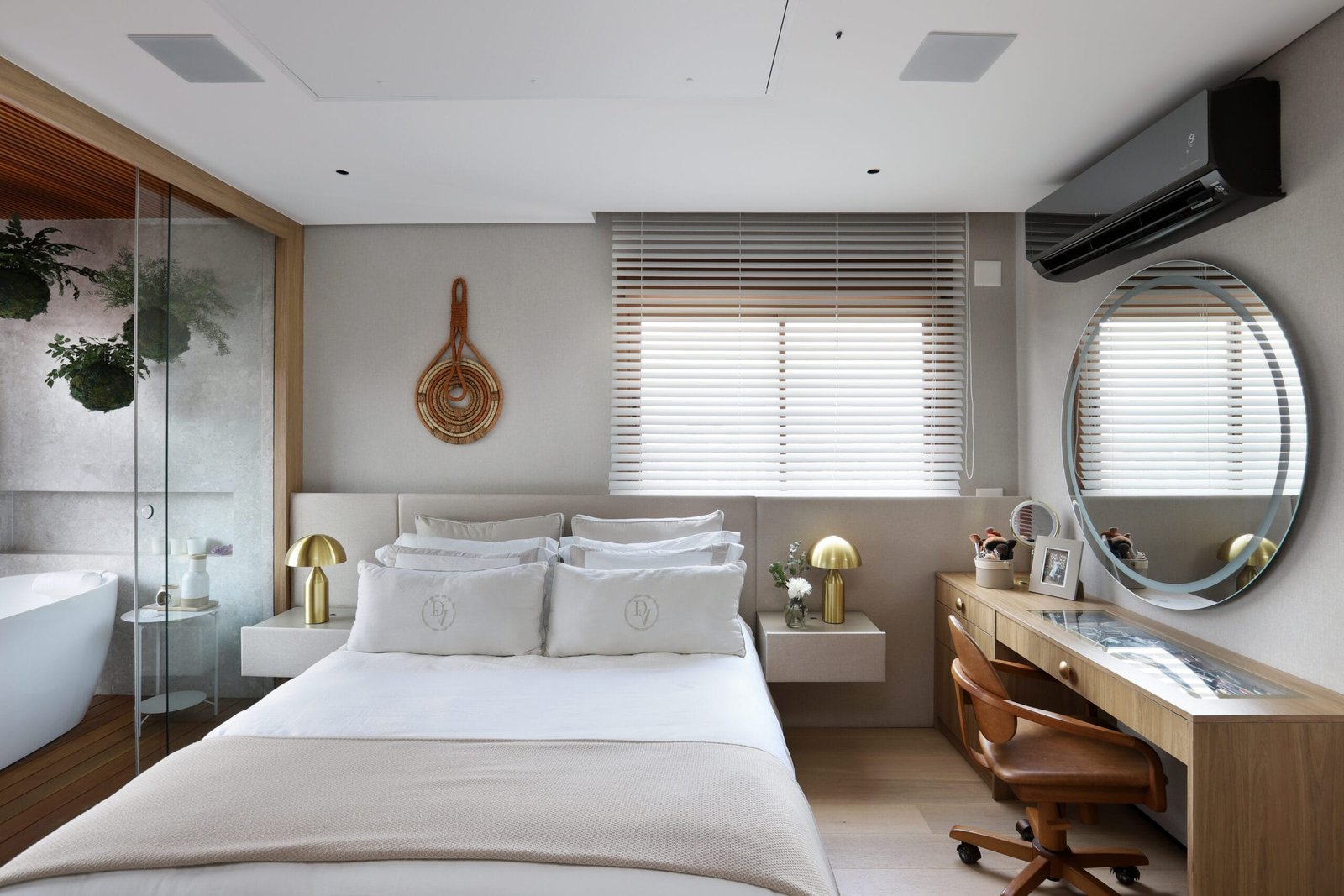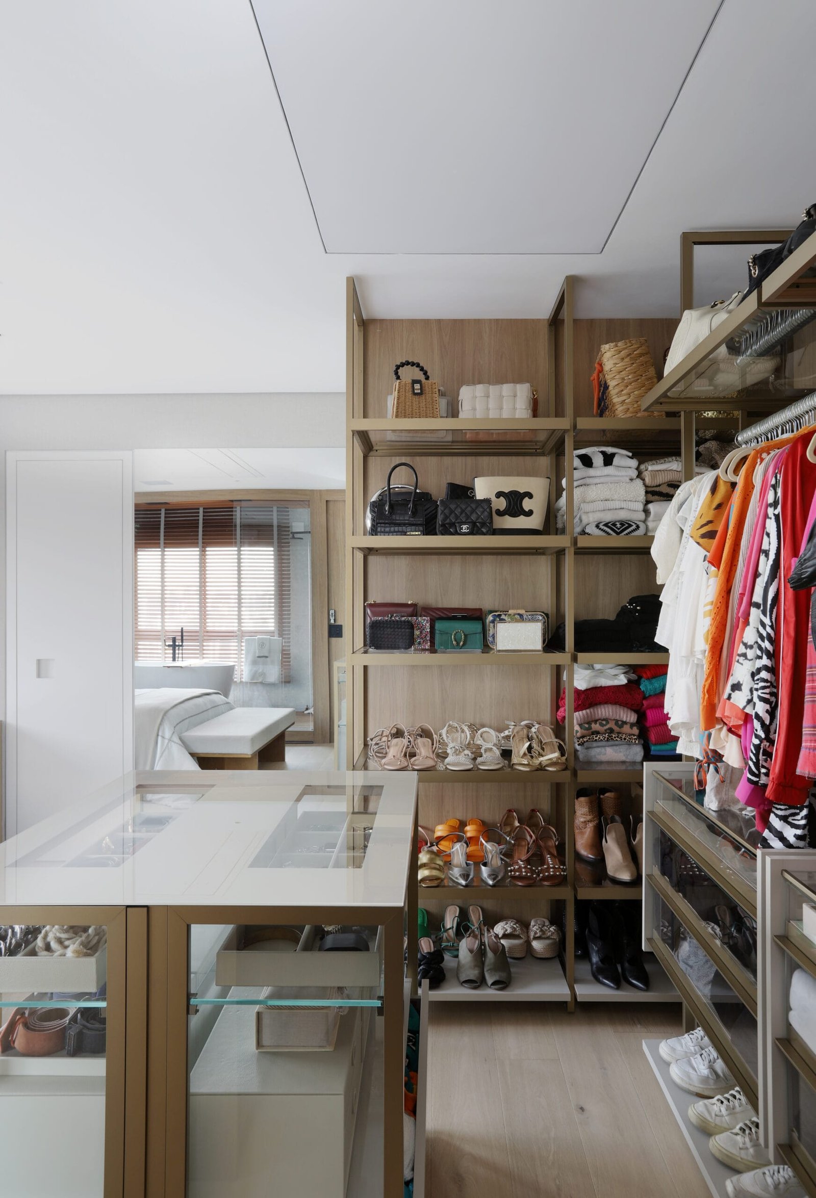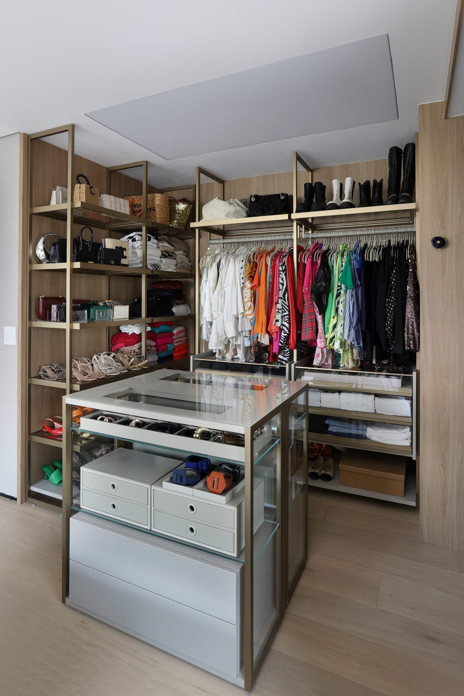 Com execução da SCA Jardim Europa em cada detalhe, incluindo a cabeceira, a suíte de casal representou o ápice do projeto, com soluções personalizadas. Depois de ocupar a área do terceiro quarto do apartamento, o dormitório cresceu e possibilitou acomodar a cama King Size, além de banheira, closet e bancada de maquiagem. Ter um closet aberto era o sonho de consumo da Dudi e para isso ela contratou uma personal organizer para catalogar todas as peças e propor uma distribuição coesa na qual o projeto fosse capaz de atender.