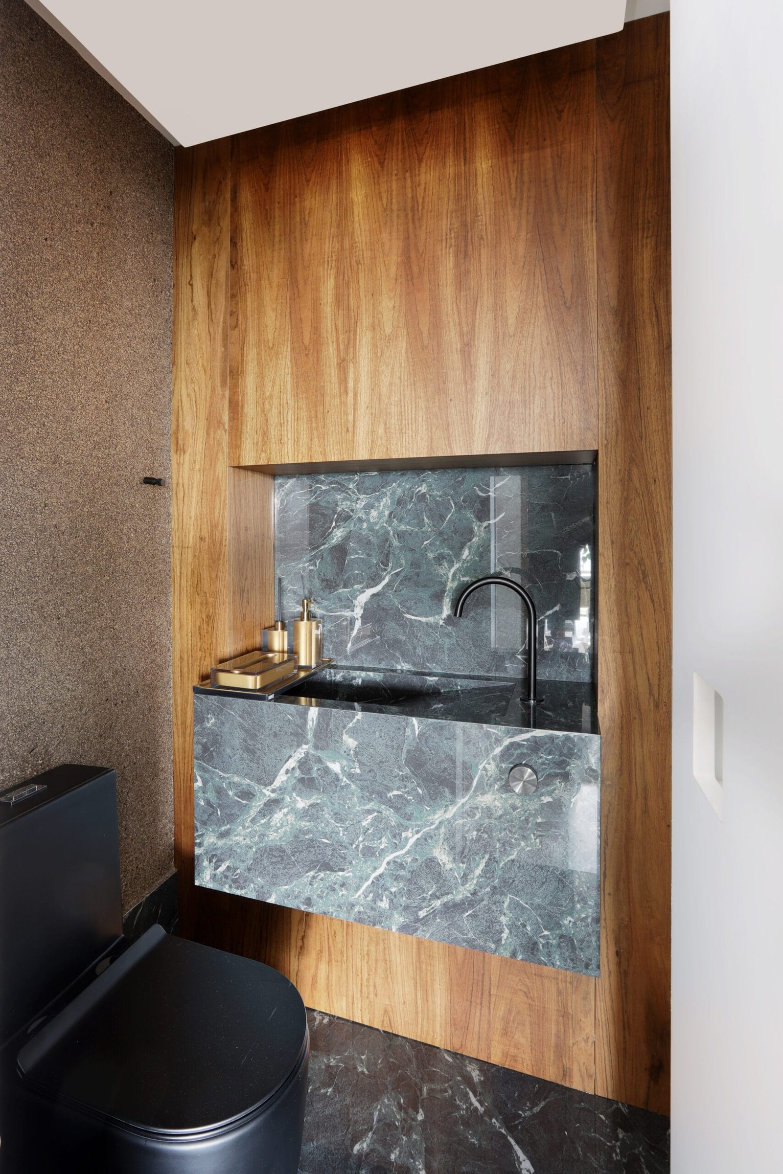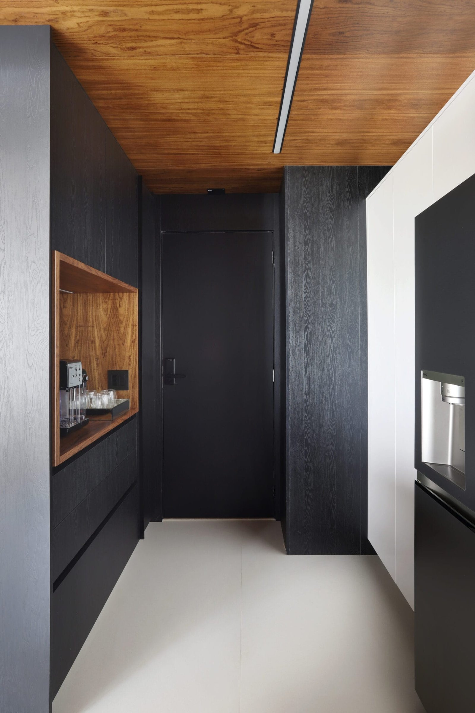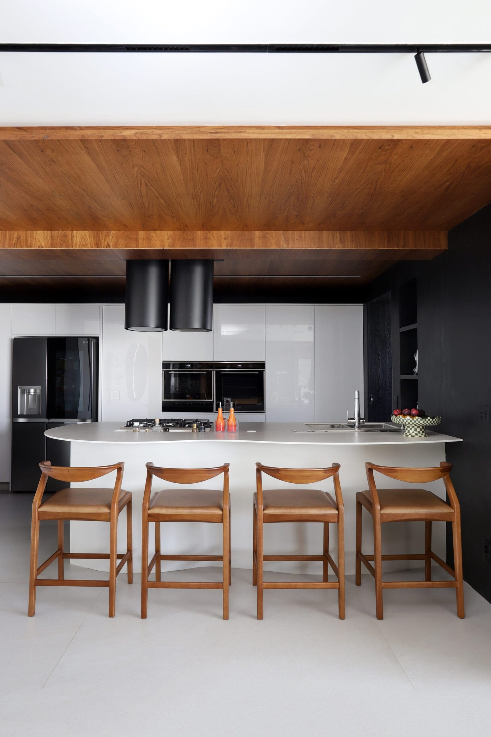 Além disso, os armários não acompanham do piso ao teto. “Conseguimos deixar essa cozinha mais harmônica dessa forma, porém a principal questão foi a ergonomia. Seria extremamente desconfortável para alcançar os itens nas prateleiras mais altas”, pontua. No interior dos armários embutidos, a arquiteta inseriu pontos de tomadas, permitindo que os eletroportáteis possam ser usados sem a necessidade de tirá-los de lá.
