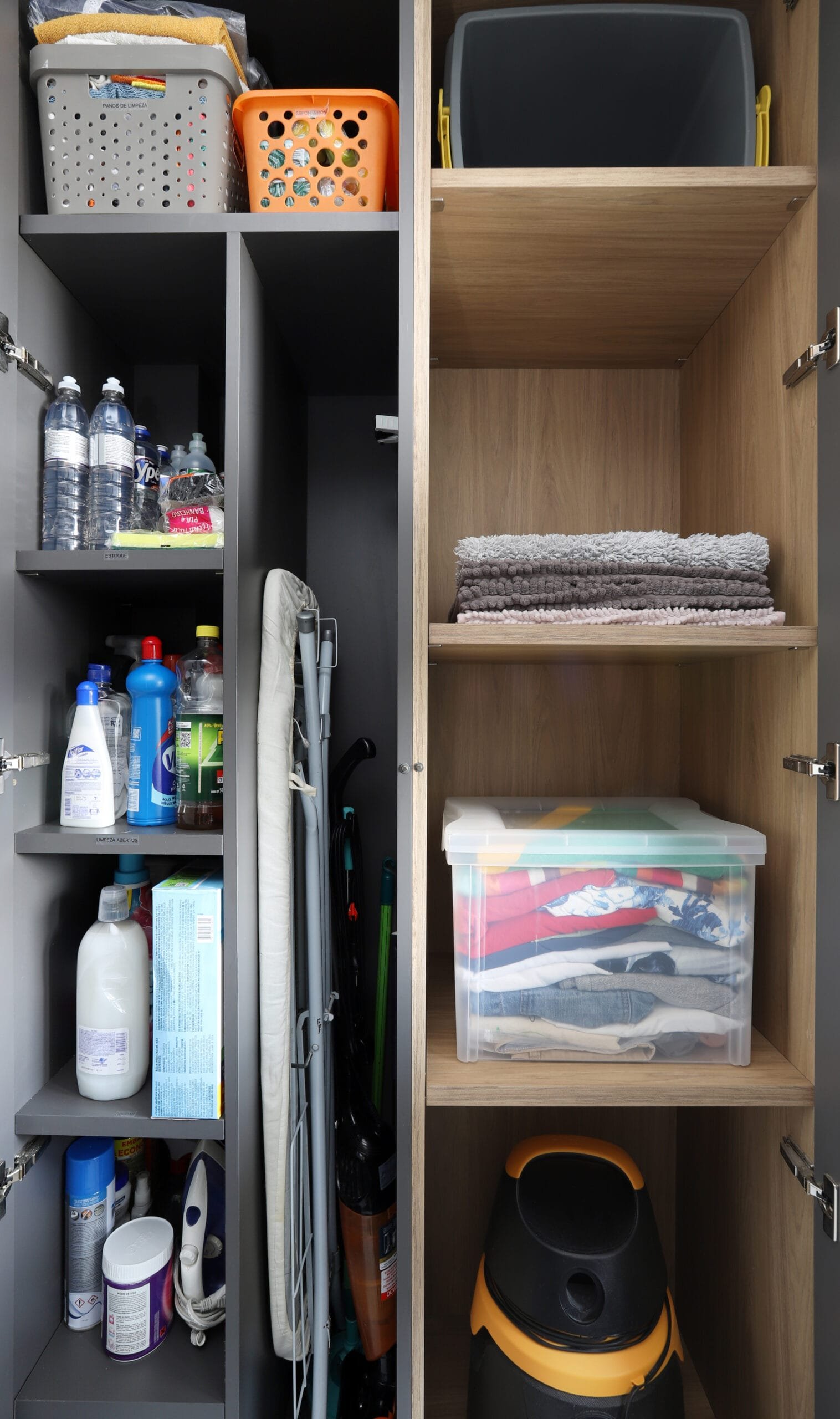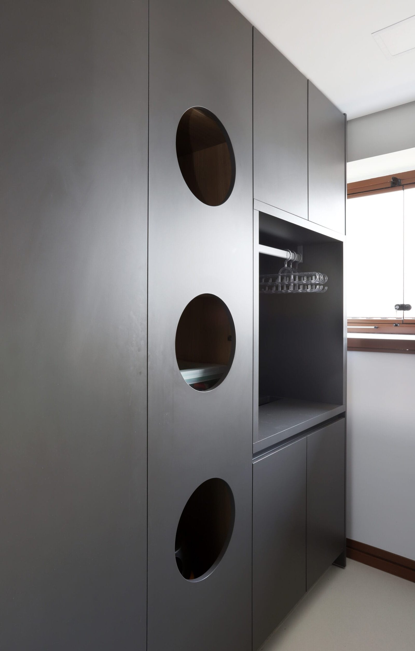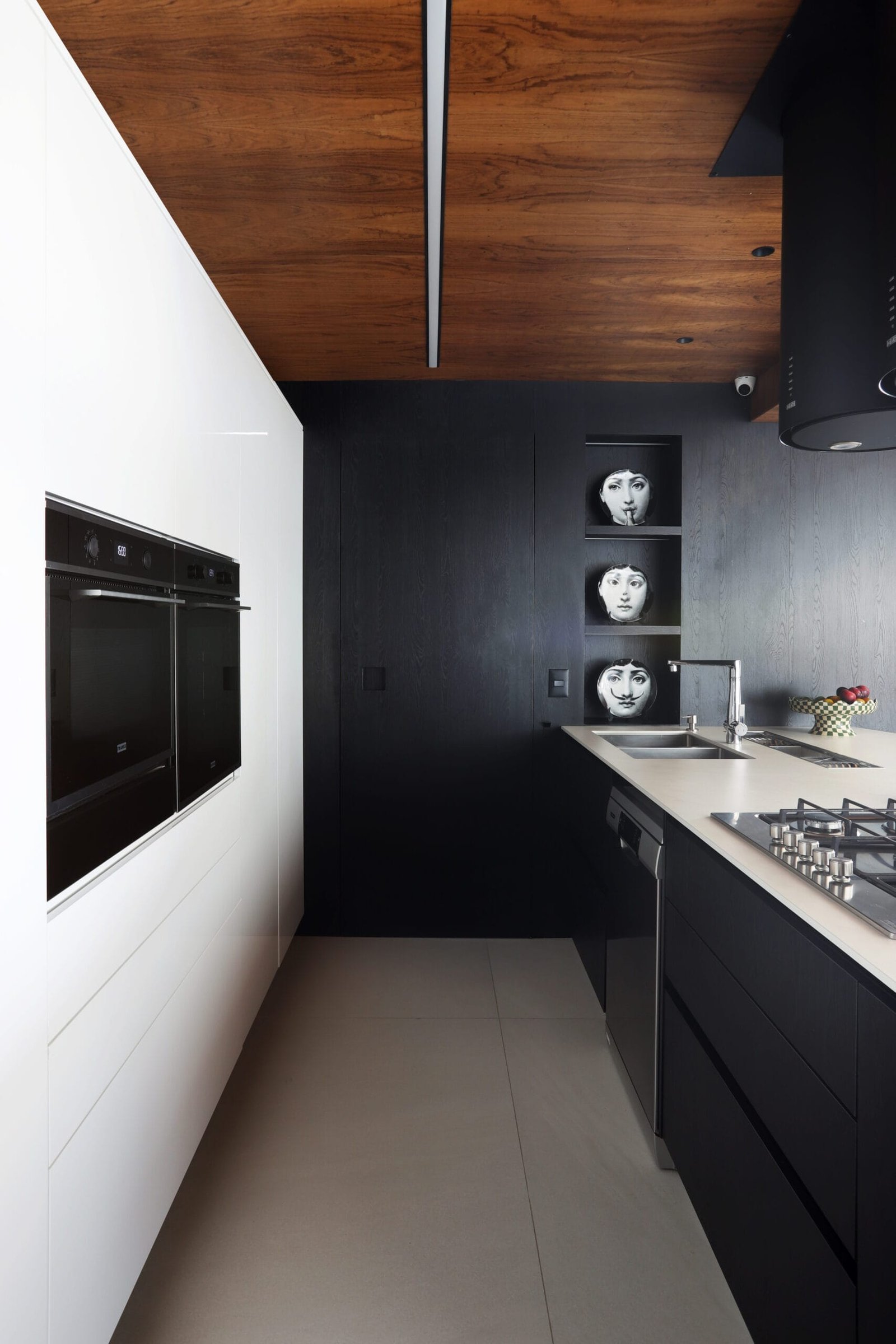 Além disso, os armários não acompanham do piso ao teto. “Conseguimos deixar essa cozinha mais harmônica dessa forma, porém a principal questão foi a ergonomia. Seria extremamente desconfortável para alcançar os itens nas prateleiras mais altas”, pontua. No interior dos armários embutidos, a arquiteta inseriu pontos de tomadas, permitindo que os eletroportáteis possam ser usados sem a necessidade de tirá-los de lá.