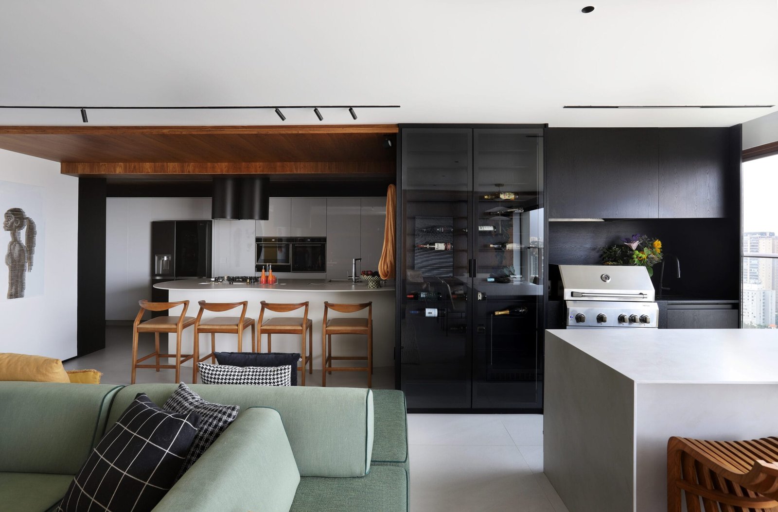 Em uma mistura equilibrada de tons claros e escuros, Dudi optou por integrar toda a área social, que inclui sala de estar, jantar, varanda gourmet e cozinha. “Meu objetivo foi favorecer a interação entre as pessoas, para que elas conversem e estejam sempre juntas”, explica. Com o projeto que propôs a ausência de paredes e divisões rígidas, a vista do bairro se abriu totalmente para as salas e a cozinha. O piso contínuo de porcelanato e o moodboard sereno contribuíram para a sensação de amplitude.