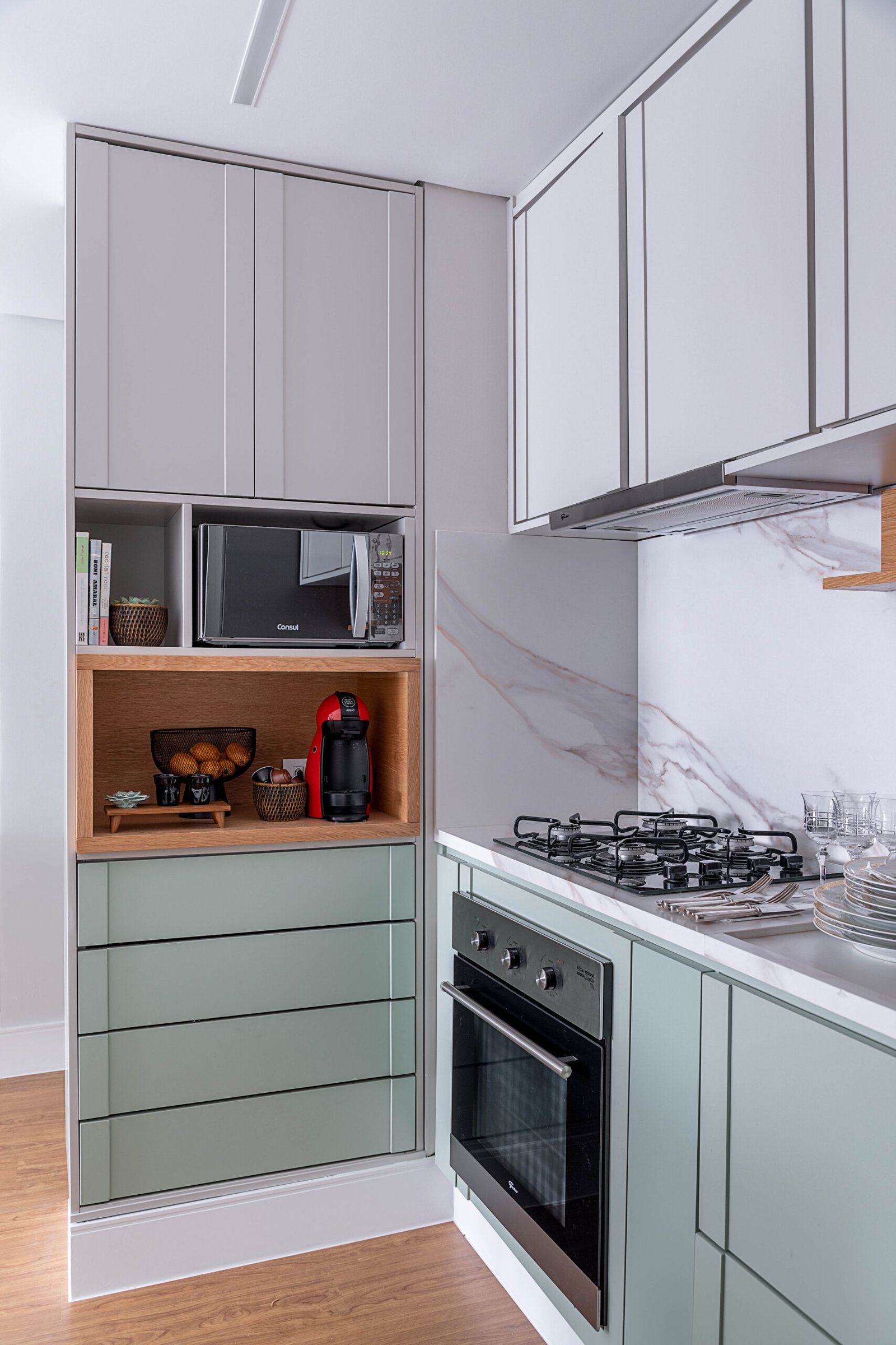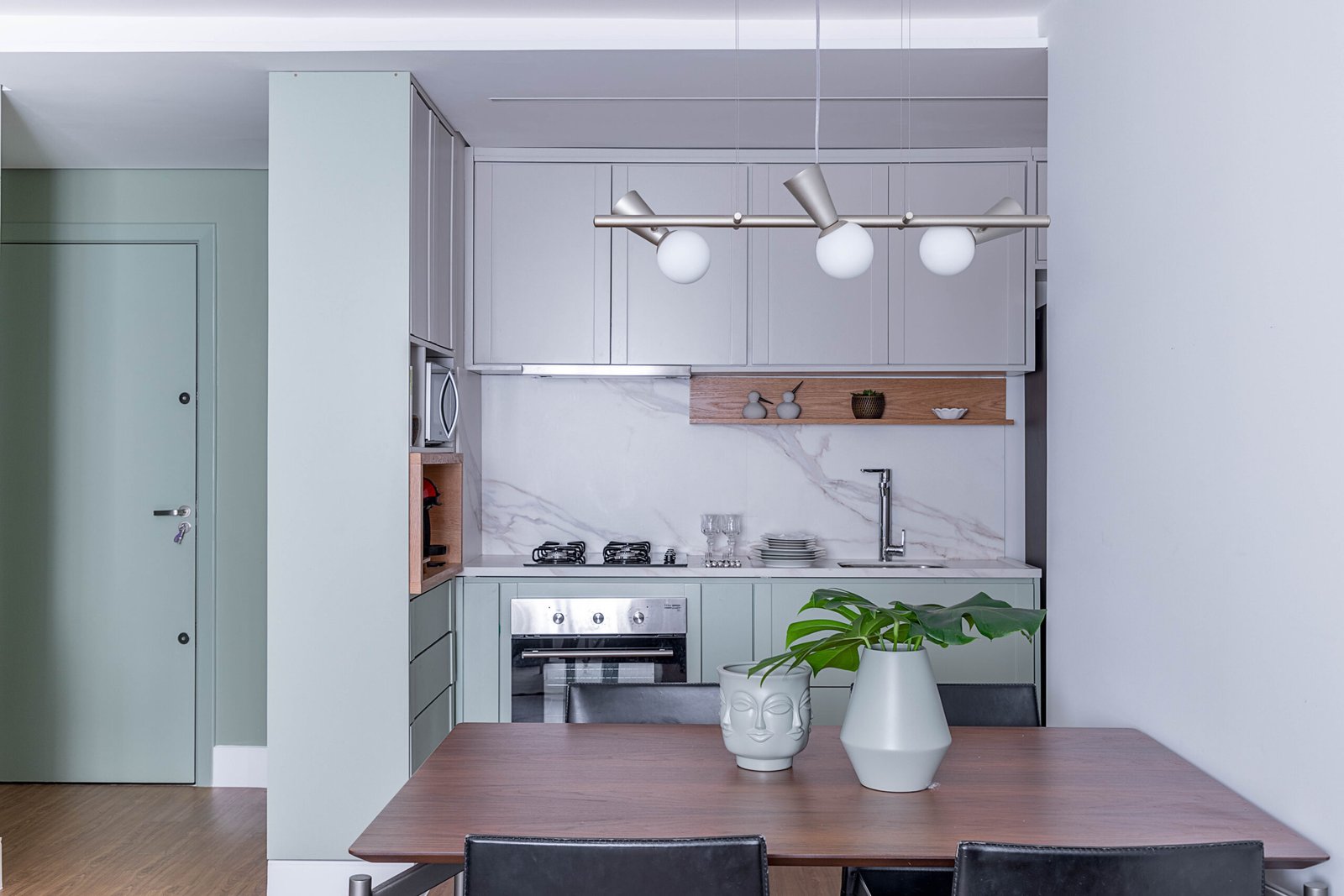 Além do verde menta e cinza fendi, neste projeto assinado pela arquiteta Carina Dal Fabbro, os detalhes em MDF amadeirado dos armários da cozinha deixaram o ambiente com ares modernos | Foto: Rafael Renzo | |
