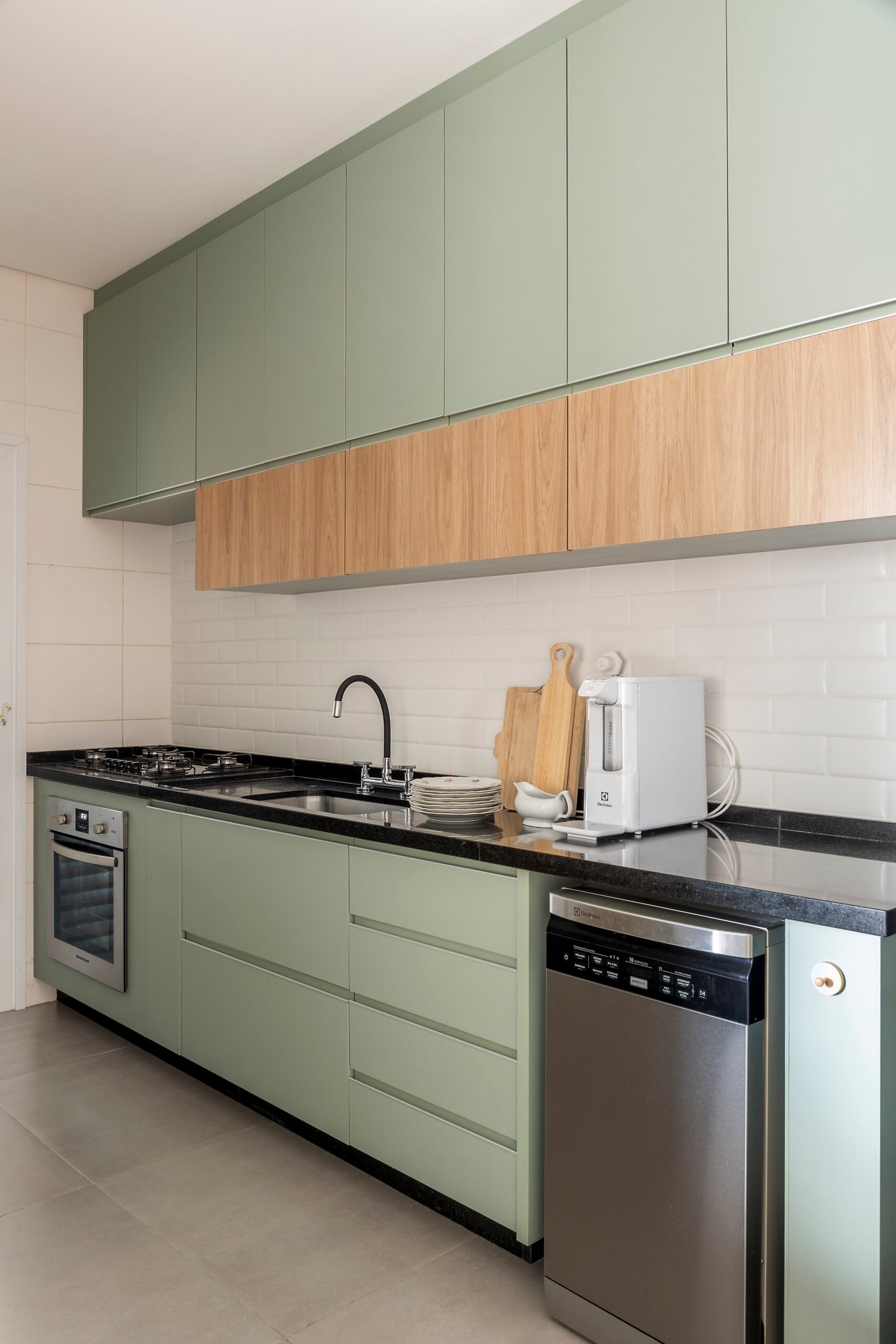 Neste antes e depois executado pela arquiteta Carina Dal Fabbro, ela optou pela troca das portas do armário da cozinha. O móvel que antes era revestido em branco e preto, característica de uma cozinha tradicional, se destacou após a nova combinação entre madeira e o tom de verde menta dos armários | Foto: Rafael Renzo | |