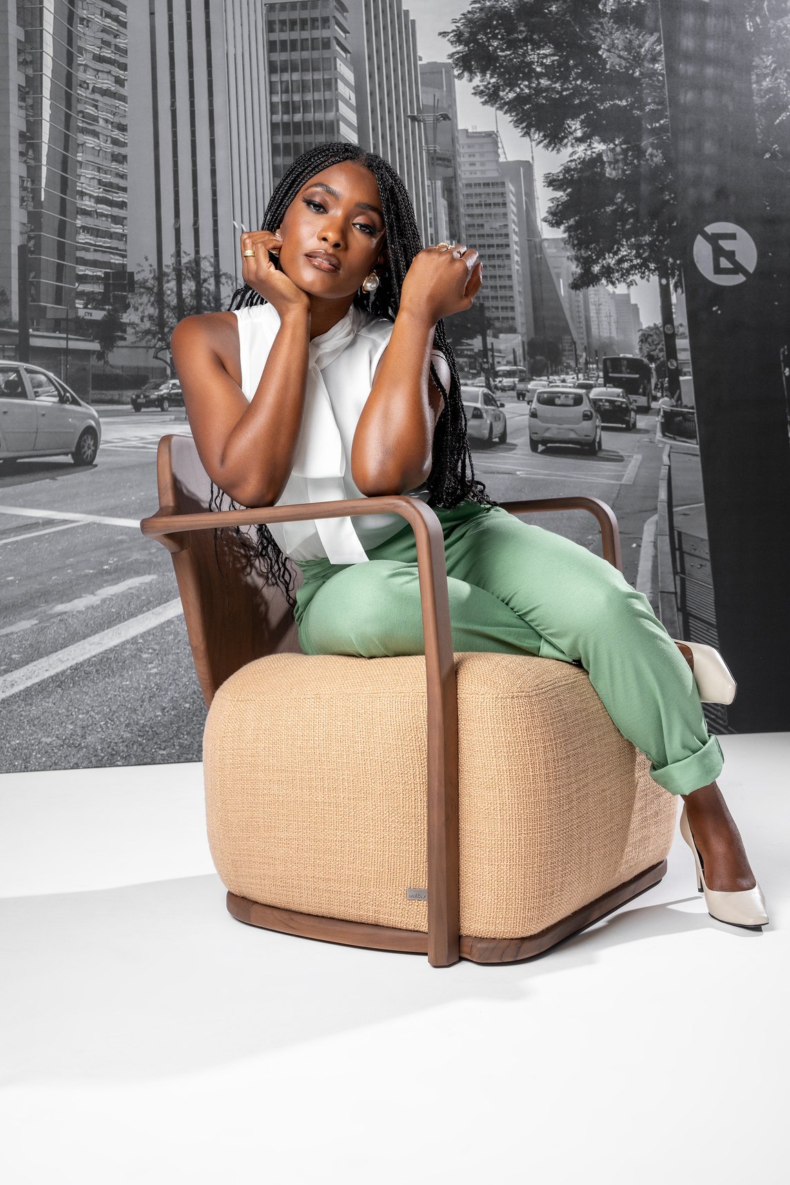 Já o banco Falésias, assinado por Aciole Félix, é inspirado na beleza imponente das falésias que emergem das águas azuis do oceano. Com uma estrutura sólida e linhas elegantes, simboliza o equilíbrio entre o ambiente construído e a serenidade natural ao redor. Félix também assina a cadeira Riva, que combina o dinamismo urbano com a serenidade da natureza. Inspirada pelo significado italiano de “riva”, que remete às margens de um rio ou lago, este mobiliário oferece conforto e elegância em um design contemporâneo com elementos naturais.